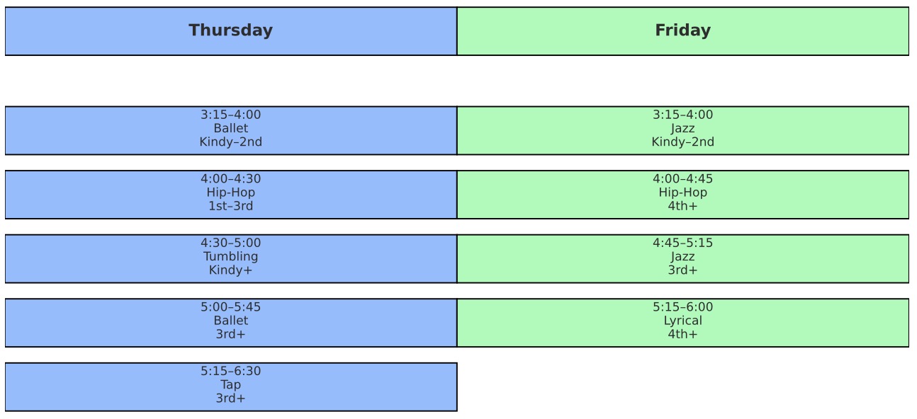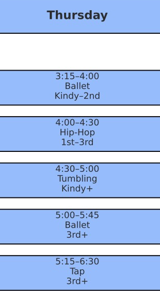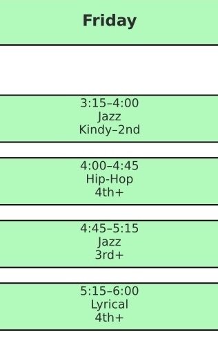 Dress code should be modest/professional. Costumes will reflect that same appropriateness. Hair will need to be up and out of the face during classes. Laura encourages all students to make sure they have the right  shoes and bring a bottle of water to class.